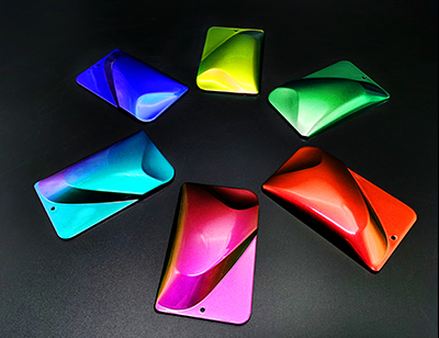 结构色颜料具有高彩度、高色纯度、高闪烁度等特点,应用于喷涂、注塑、涂布等各种工艺的装饰应用,可以赋予产品独特的色彩与质感
